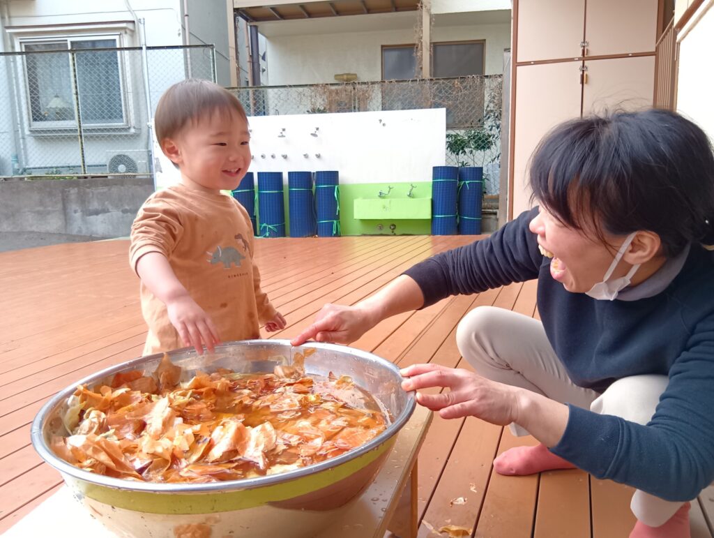 広い園庭では、ドロケイ、ドッチボールなど思いきり身体を動かして存分にあそぶことができます。泥あそびや水あそび、絵の具あそびなどの様々な感触に触れてあそんでいます。あそびがつながる・ひろがる園庭改造計画中です。また、桜・柿・柚子などたくさんの木々に囲まれ、畑では季節の野菜を育て、四季を感じながら過ごしています。育てた野菜や果実で干し柿、ゆずジャムなどを作って食べる食育活動にも力を入れ、育てた野菜の美味しさを感じています。